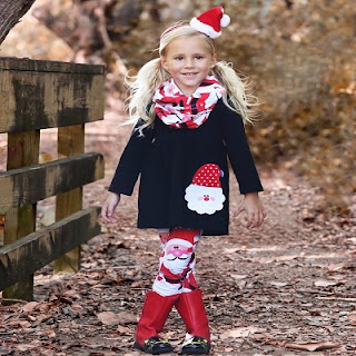 Girls Santa applique tunic with Christmas leggings + scarf set: This amazing looking festive dress comes with leggings and a scarf that is a holiday season special. The memories you and your family made will be etched forever on the top along with the Santa made on it. This dress is half part happy and half part joy!