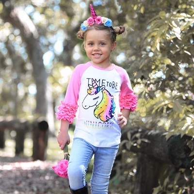 Girls unicorn graphic top with 3/4 ruffle sleeves: This beautiful looking top lets your young one have the mythical creature that everyone loves. With a printed unicorn and a beautiful pink a white look, this top is a favorite amongst the kids. With your little ones, a unicorn will never go out of fashion.