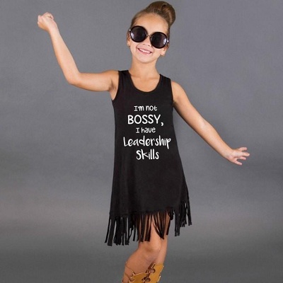 Girls “I’m not bossy” graphic fringe dress: More of a statement than a dress. This graphic fringe dress, screaming the words that describes the future leader you have in your house, is the confidence booster she needs to believe in herself. This outfit lays down both confidence and an Ironclad will that burns bright in her heart and makes her lead the way to become the leader that she is.