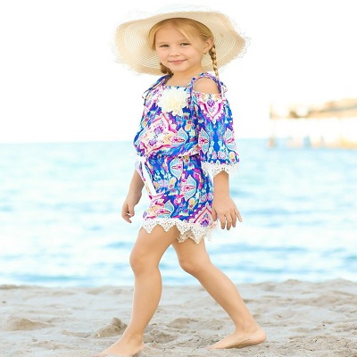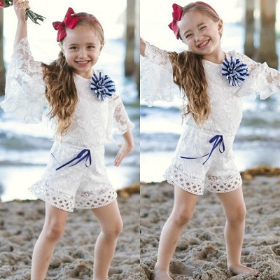 Girls ivory lace bell slope romper: Not technically a Jumpsuit but a beautiful romper altogether. This light dress that emanates comfort and easy movement by its presence alone, this bell slope romper looks beautiful! The huge flower on it only makes the dress look even more fun! This is the go-to dress for your perfect vacation.
