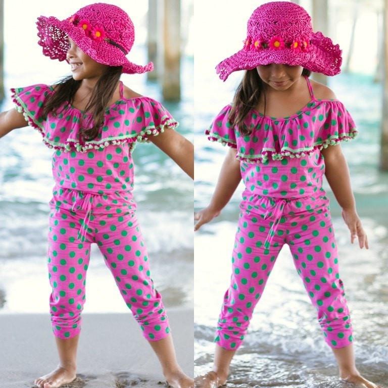 Girls pink and green polka dot pom-pom ruffle jumpsuit: Your day at the beach will only begin to shine brighter with your child wearing the beautiful pom-pom ruffle jumpsuit. The polka dots make everything fun and the sheer quantity by which it is sold, it’s no doubt It’ll be a fashion statement this summer!